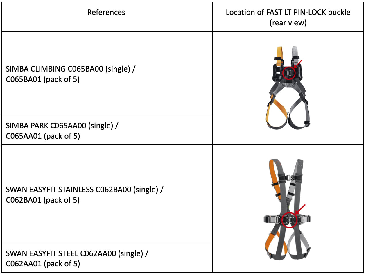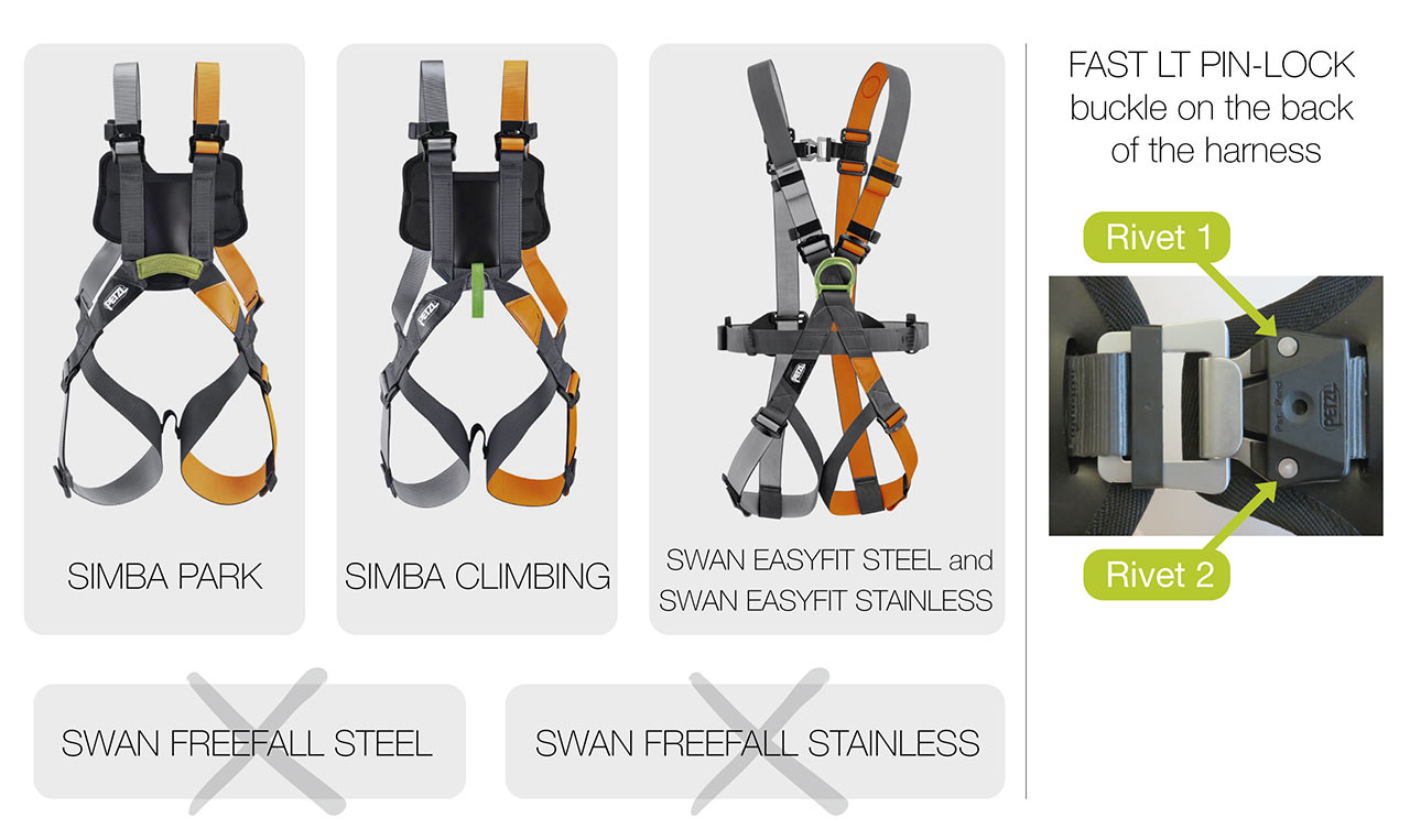 Poziv na vizualni pregled pojaseva SIMBA CLIMBING/SIMBA PARK i SWAN EASYFIT STEEL/SWAN EASYFIT STAINLESS nakon što je na jednom pojasu uočeno da nedostaje zakovica na FAST LT PIN-LOCK kopči na stražnjoj strani pojasa.